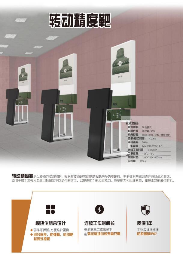 昆山九毫米電子科技有限公司:18691818382,是一家專業(yè)從事部隊,武警,公安射擊訓練器材的研發(fā)、 設計、生產(chǎn)型企業(yè)。公司產(chǎn)品以智慧化靶場,激波報靶設備為核心,主營產(chǎn)品包括起倒激波靶、升降激波靶、固定激波靶、起倒靶、升降靶、轉(zhuǎn)動靶、移動靶、起倒轉(zhuǎn)動靶、地堡靶、裝甲移動靶、裝甲起倒靶、運動靶等各類靶機設備。